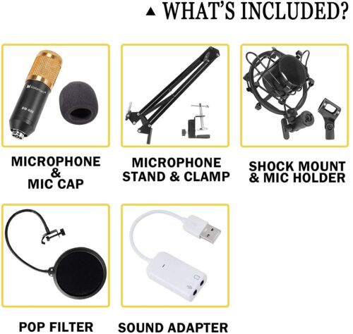 COMPATIBLES avec les systèmes WINDOWS et Mac OS. Le kit de microphone à condensateur USB comprend - (1) microphone à condensateur + (1) support de bras de ciseaux à suspension réglable + (1) pince de montage de table + (1) support antichoc + (1) filtre anti-pop + (1) anti -Capuchon en mousse anti-vent + (1) câble 3,5 mm mâle vers XLR femelle (1) pince pour microphone + (1) adaptateur audio USB + (1) manuel d'utilisation